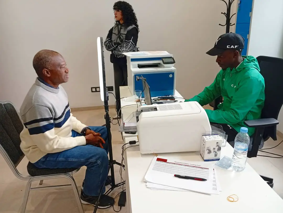 اتصلنا برجال الأمن الذين أوضحوا لنا أن لديهم تعليمات من الاتحاد الأفريقي لكرة القدم (CAF) بعدم السماح لأي زائر غير مصرح به بدخول الفندق. ولكن عندما أظهرنا لهم بطاقات الاعتماد الخاصة بنا، استرخوا أثناء انتظارنا.